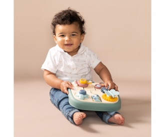 Activity tablet with 5 different and original activities: a labyrinth, a door with a lock, gears that make the butterfly flap its wings, two rollers to create funny animals and a hippopotamus that moves its legs when you press its belly.