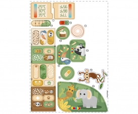 Tu as tout à disposition pour soigner au mieux les animaux sauvages : 1 seringue avec action mécanique, 1 thermomètre avec action mécanique, 2 flacons, 1 stéthoscope, 2 boîtes factices, 1 carnet de santé à personnaliser et des pansements repositionnables.